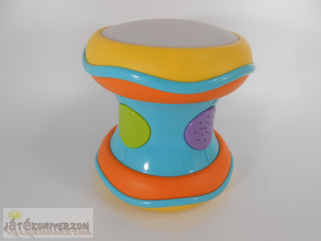 Széle karcos, ezen kívül jó állapotú. A dob tetejét kézzel ütőgetve különböző hangokat ad ki magából, a teteje színesen világít közben. Az oldalsó gombok megnyomására zenél, hangokat ad ki magából. Mozgatásra, rázásra is reagál. Segít a ritmusérzék, a hallás és a zenei érdeklődés fejlesztésében. Hangerő szabályozható. 3 darab AA elemmel működik. Plusz költségért elemmel is kérheted.