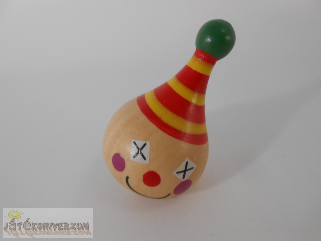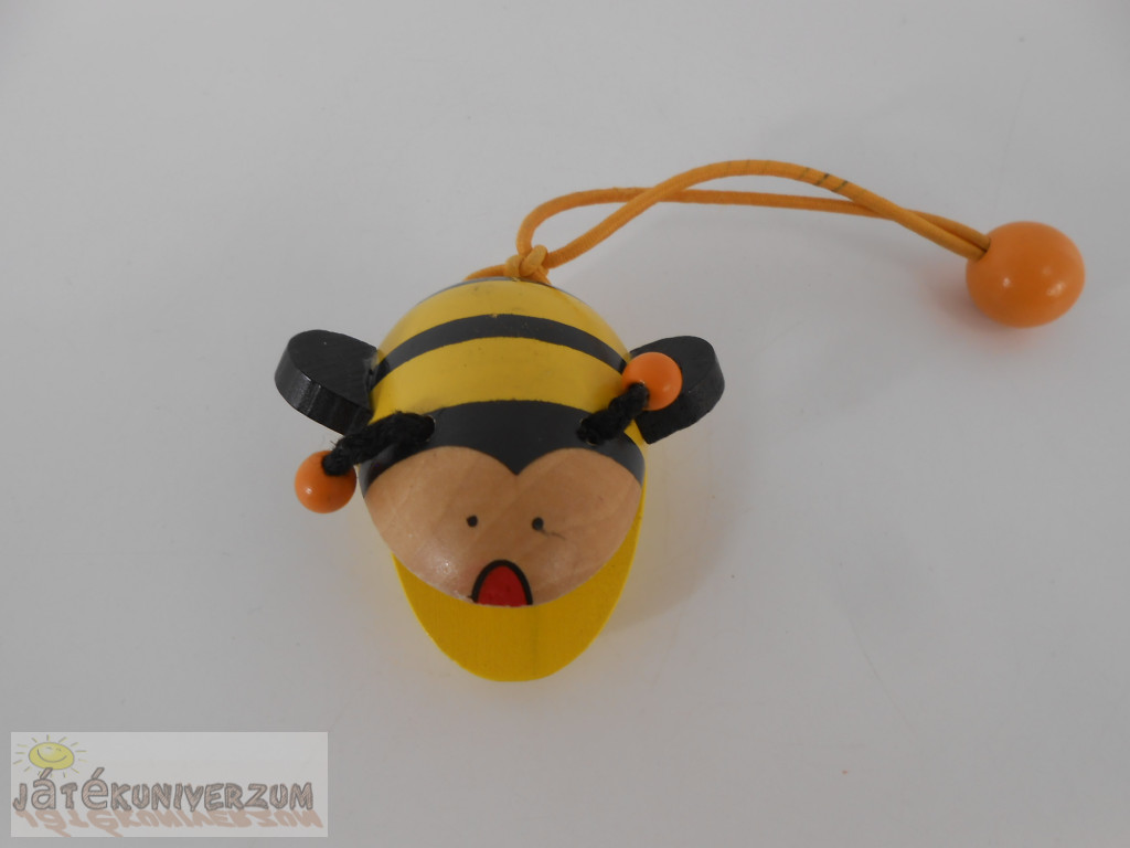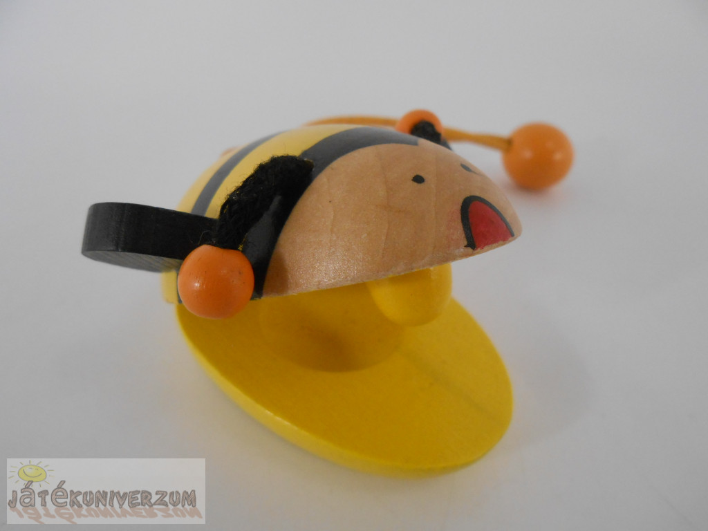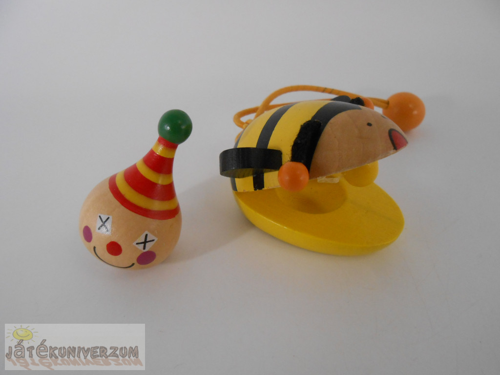 2 darabos. A bohóc pörgettyű. A méhecske kasztanyetta, festése picit kopott, a madzagja foltos.