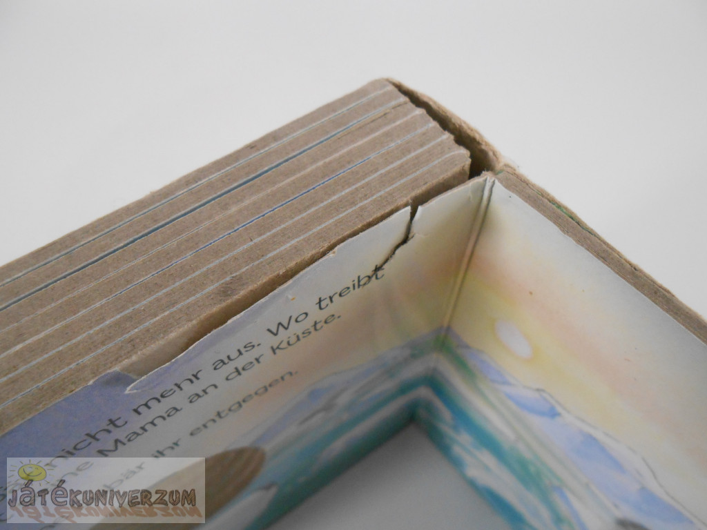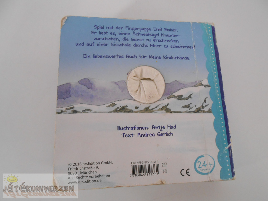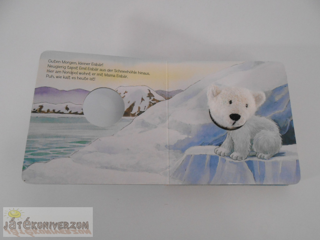Német nyelvű. Emil, a jegesmedve a főszereplője. Kemény lapos-táblás. Az utolsó lapja sérült. A könyv gerince ragasztva van.