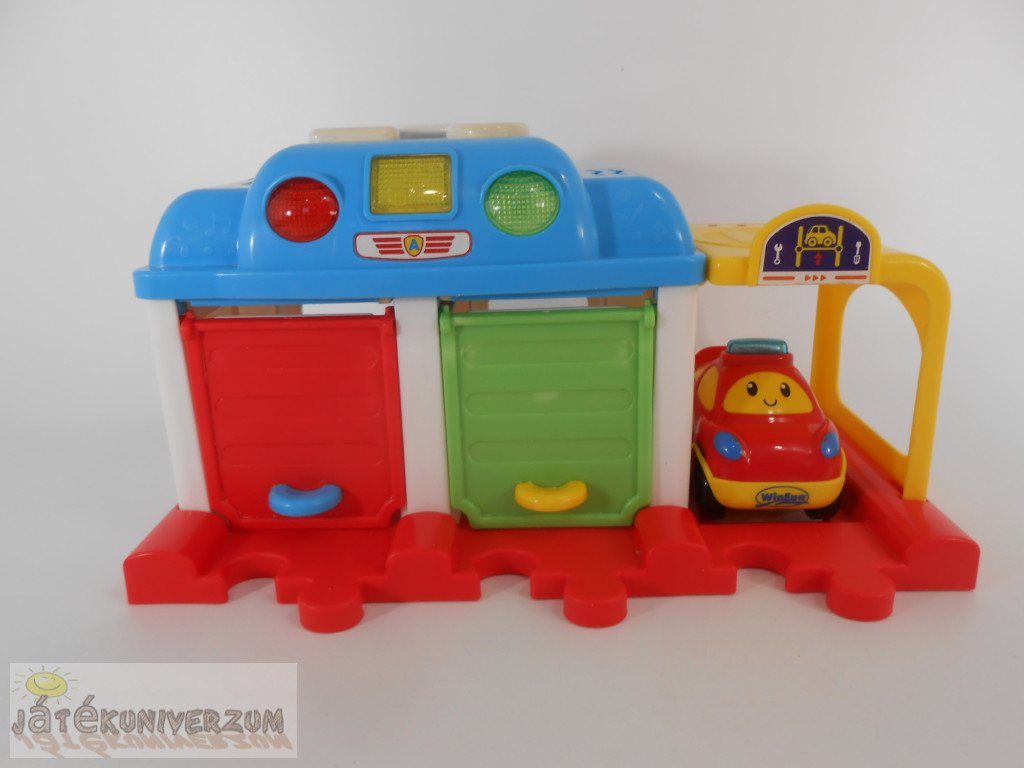 Hiányos. 3 darab pici felhajtható út elem hiányzik belőle. Karcos, festése picit kopottas. Az egyik garázsajtó foltokban ki van fehéredve. Alapos tisztítást igényel. Az autó angol nyelven beszél, egyéb hangokat ad ki magából. A garázs angol nyelvű. 3 fajta üzemmód. Az üzemmód váltáskor finoman toljuk a gombot. Az utoló jel (zzz) a kikapcsoló része. Formák, színek és tárgyak megismerése. A garázsajtó felnyitására is hangot ad ki magából. Az autó 1, a garázs 2 darab AA elemmel működik. Plusz költségért elemmel is kérheted.