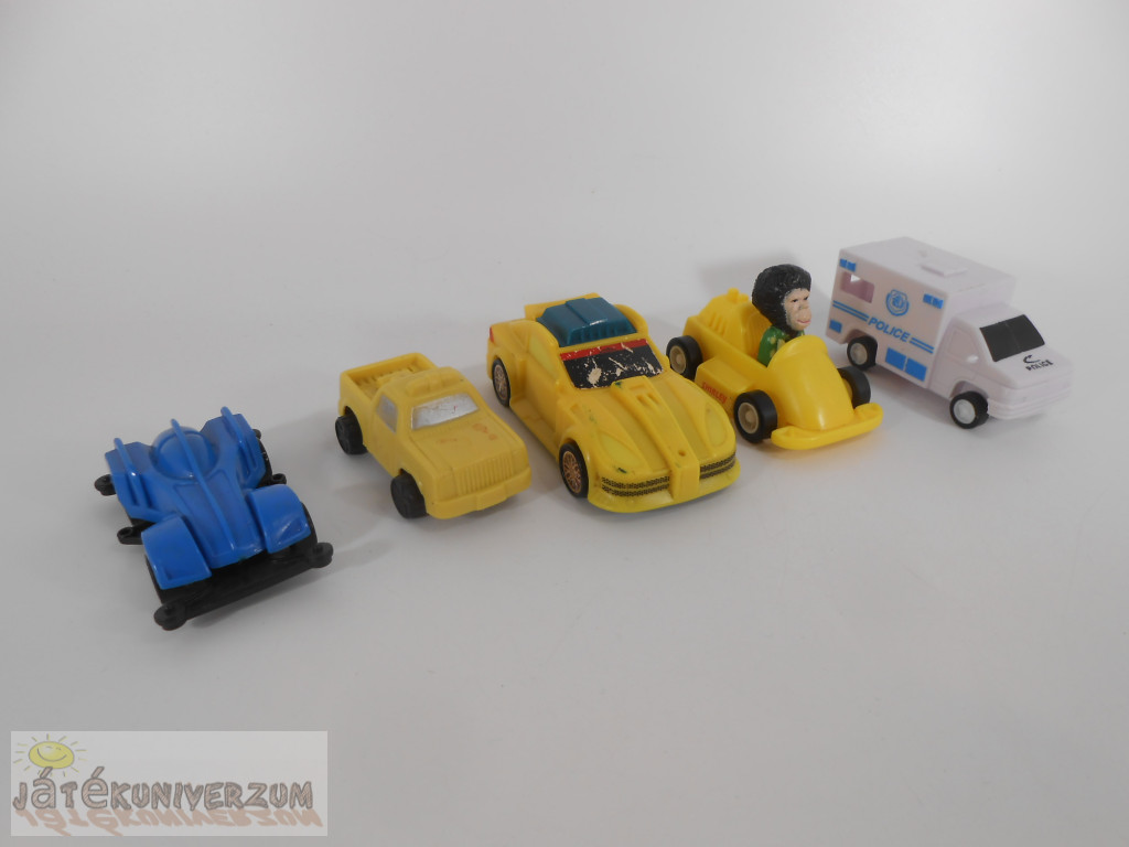5 darabos. Anyaguk műanyag. Kettő sárga autón folt, kopások vannak rajtuk.