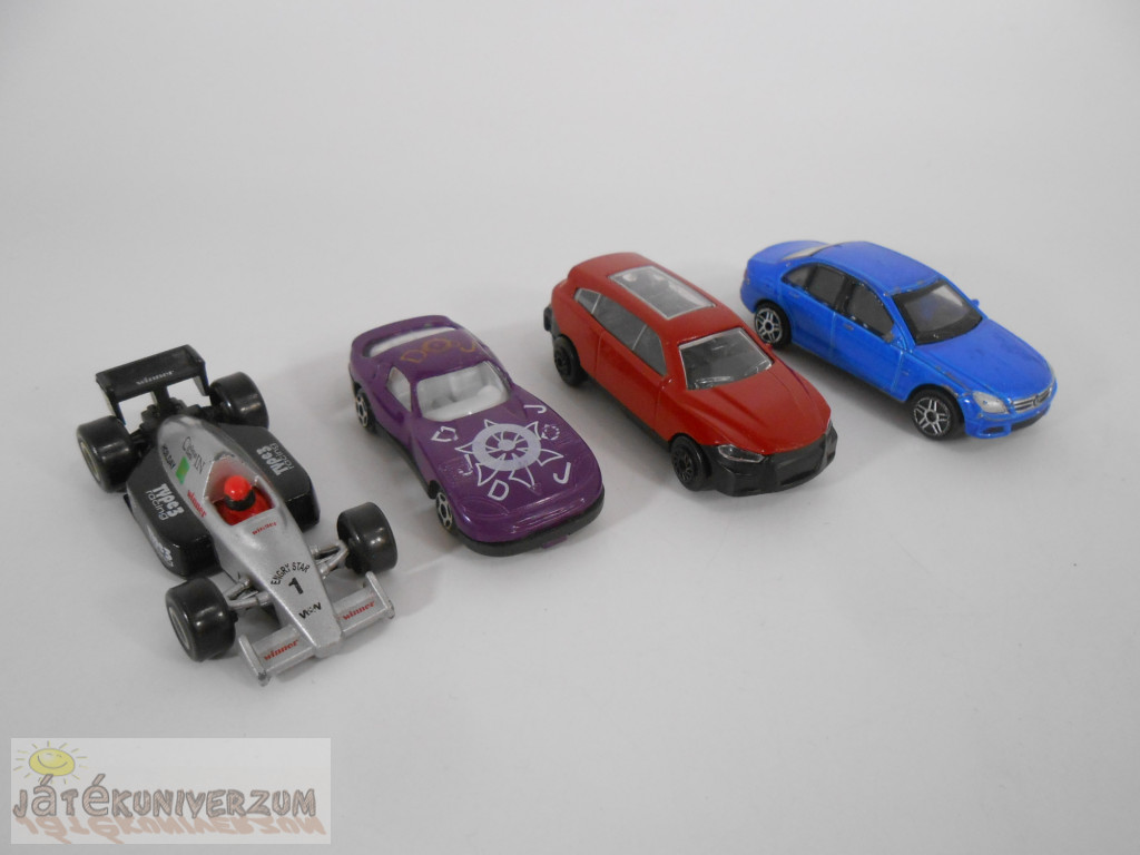 4 darabos. Anyaguk fém és műanyag. A kék autónak a festése kopottas, a többi autó jó állapotú.