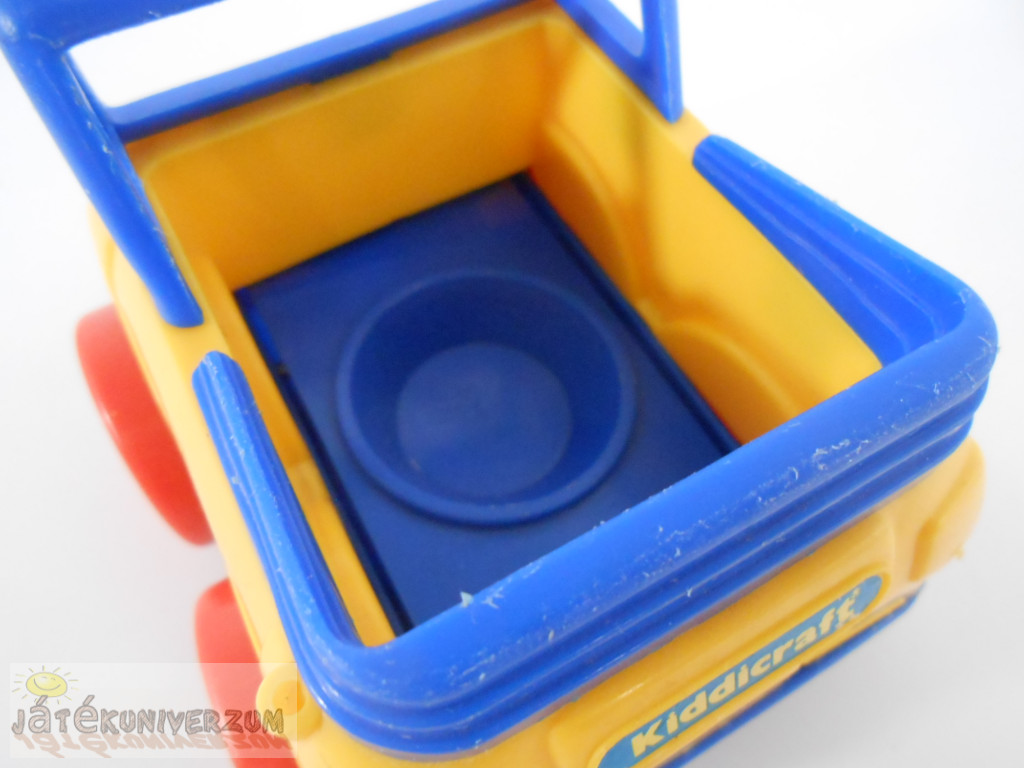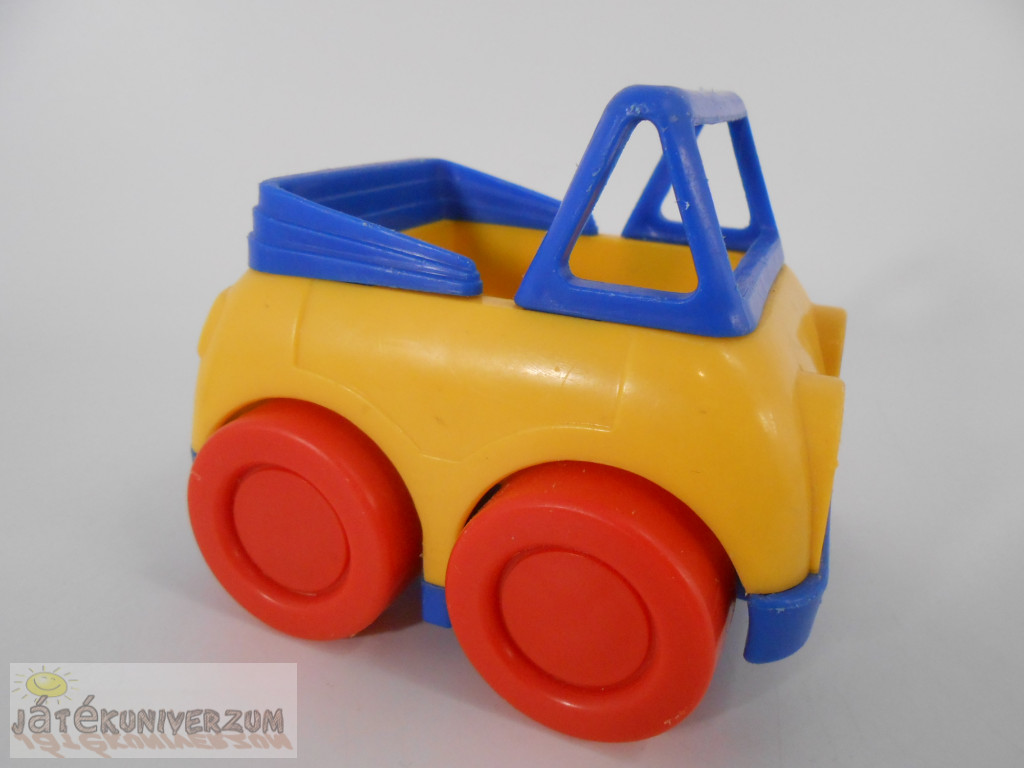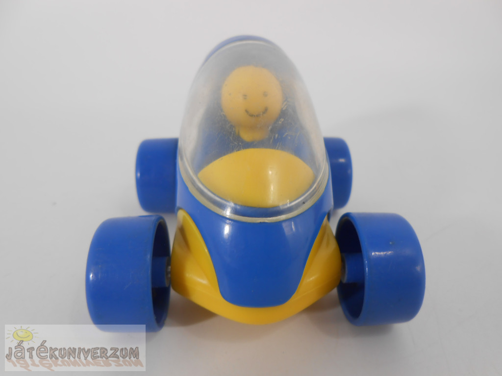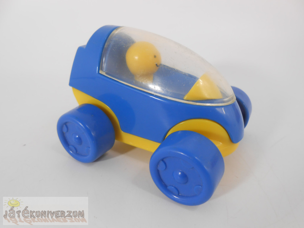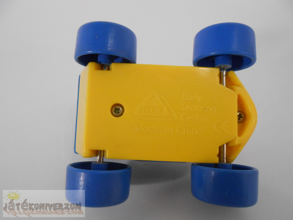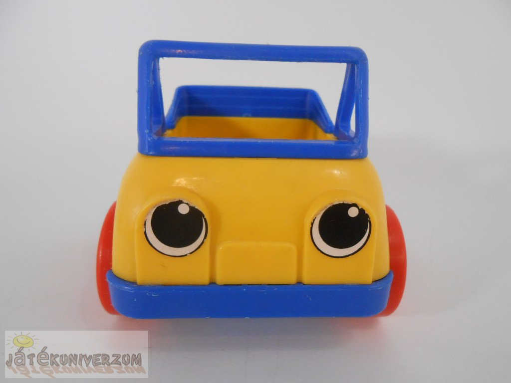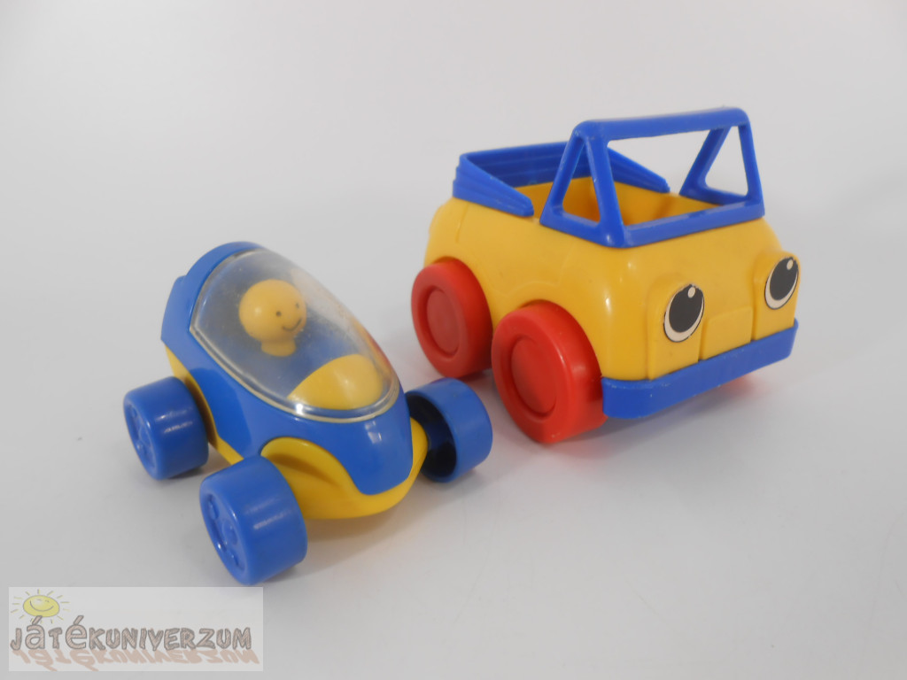 Anyaguk műanyag. A figurás autó ELC márkájú. Felületén kopások, karcok vannak. A figura nem kivehető. A sárga autó vintage, Kiddicraft márkájú. Felületén karcok, kopások vannak rajta. Figura nincs hozzá.