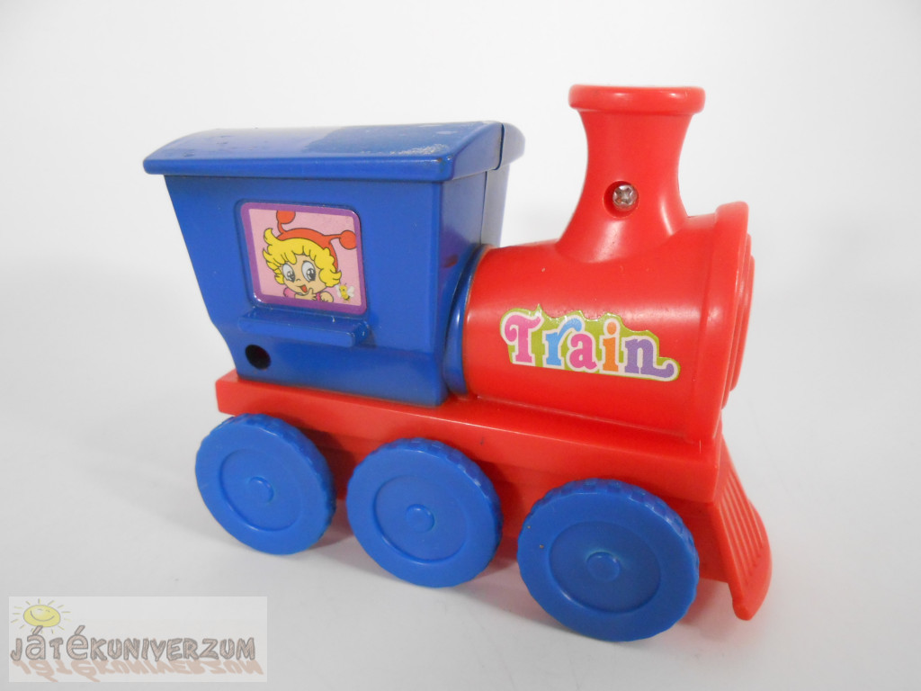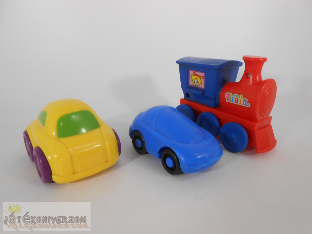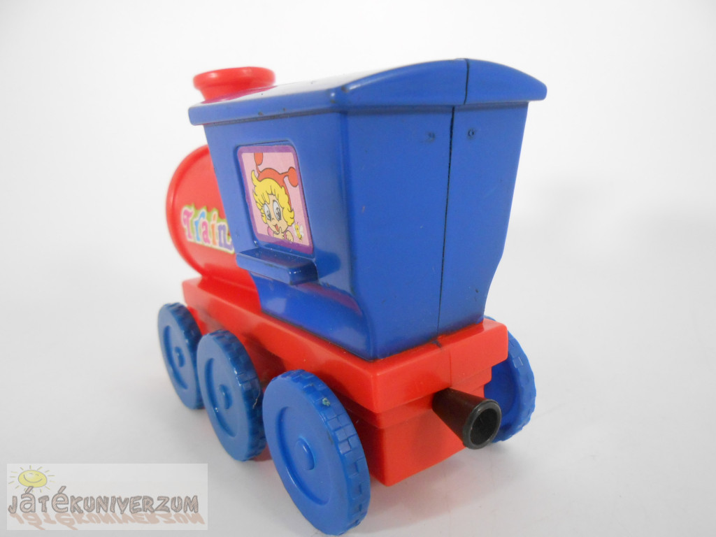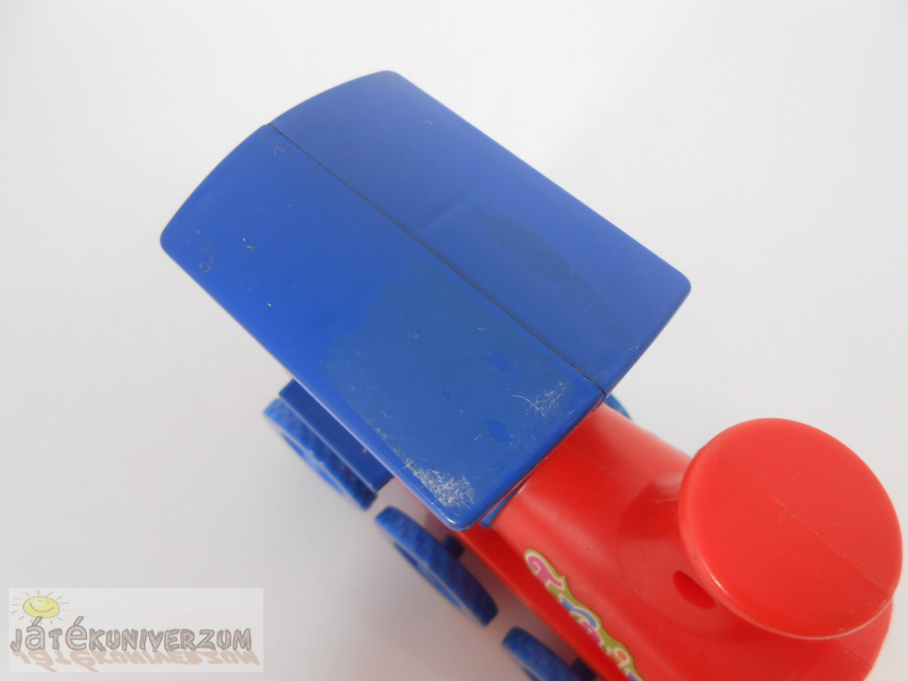 3 darabos. Anyaguk műanyag. A vonaton hátul lévő beépített madzagot meghúzva, majd elengedve, a vonat magától elgurul. A vonat teteje foltos. A használatból adódó karcok és kopások vannak rajta.