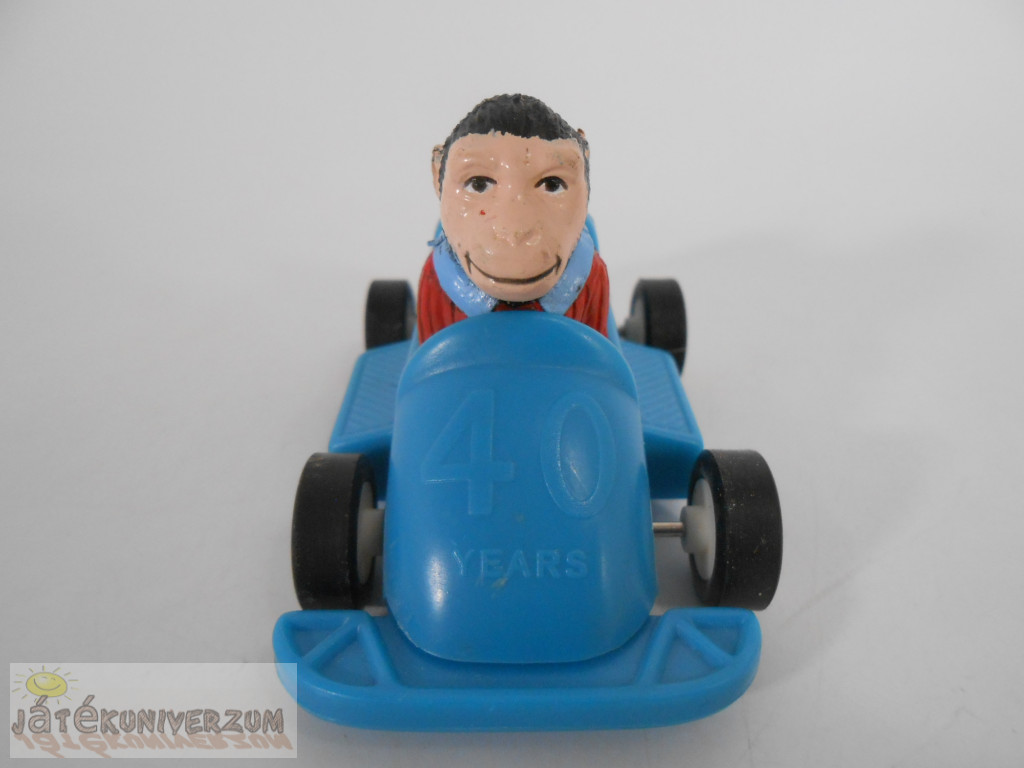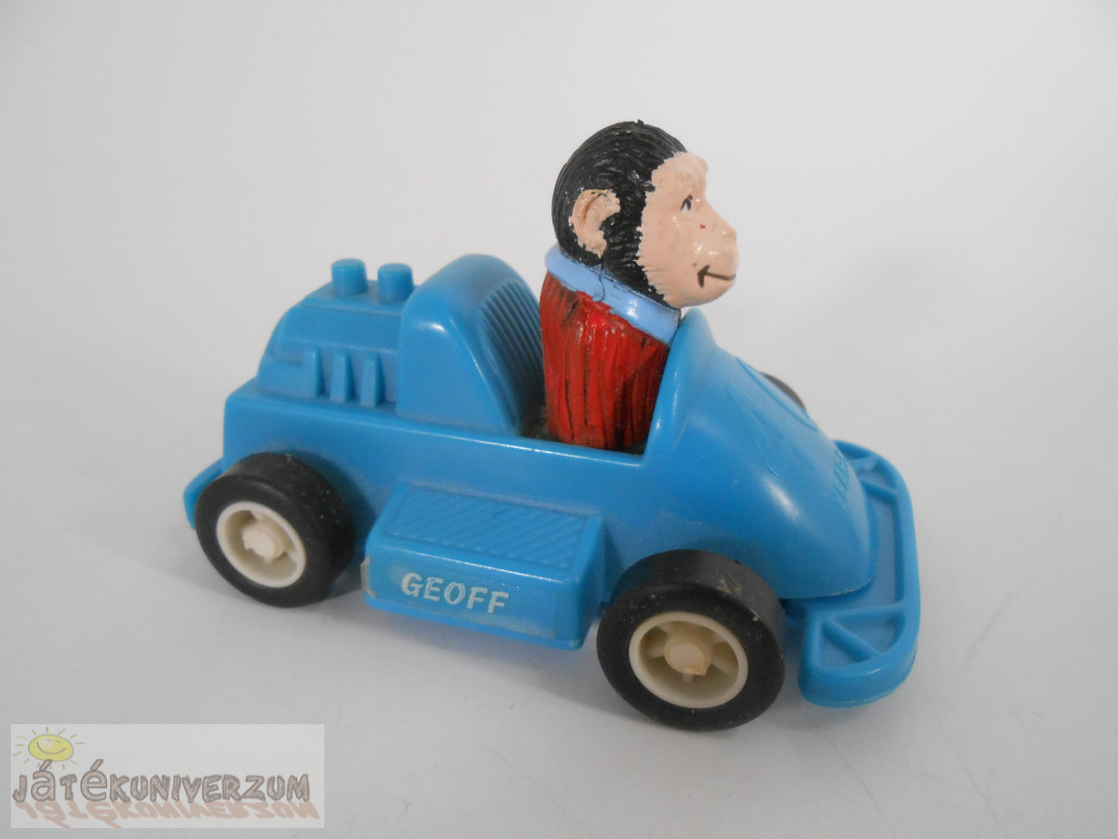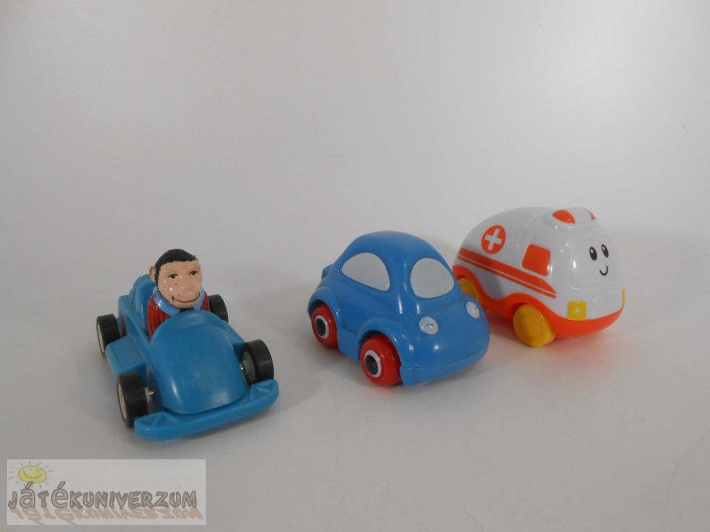 3 darabos. Anyaguk műanyag. A kék autónak a festése kopottas, a többi autó jó állapotú. A majmos autó hátrahúzós.