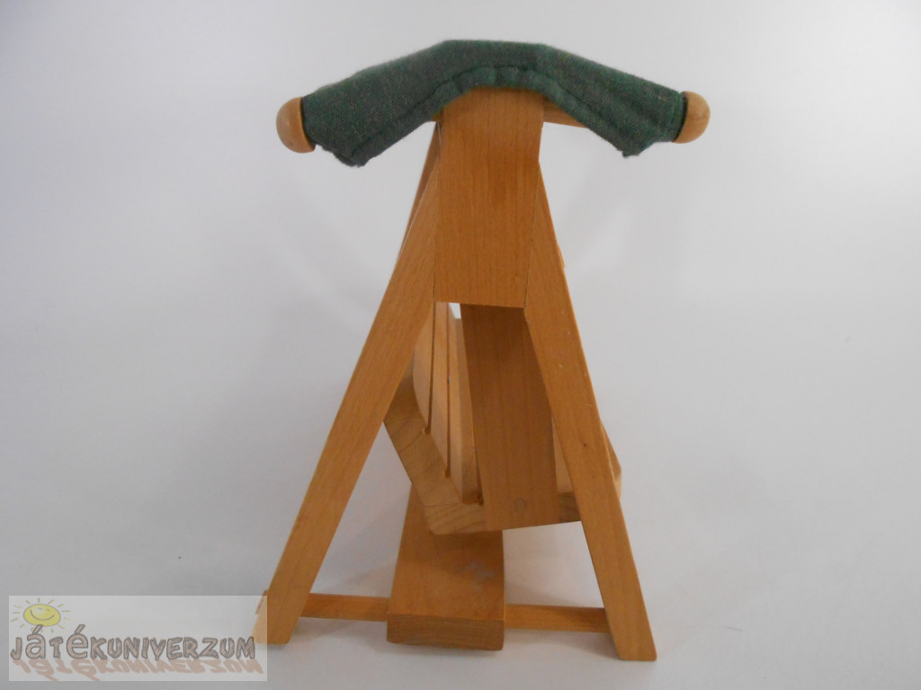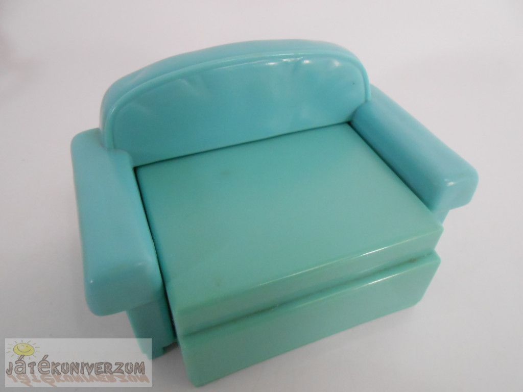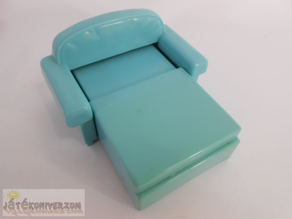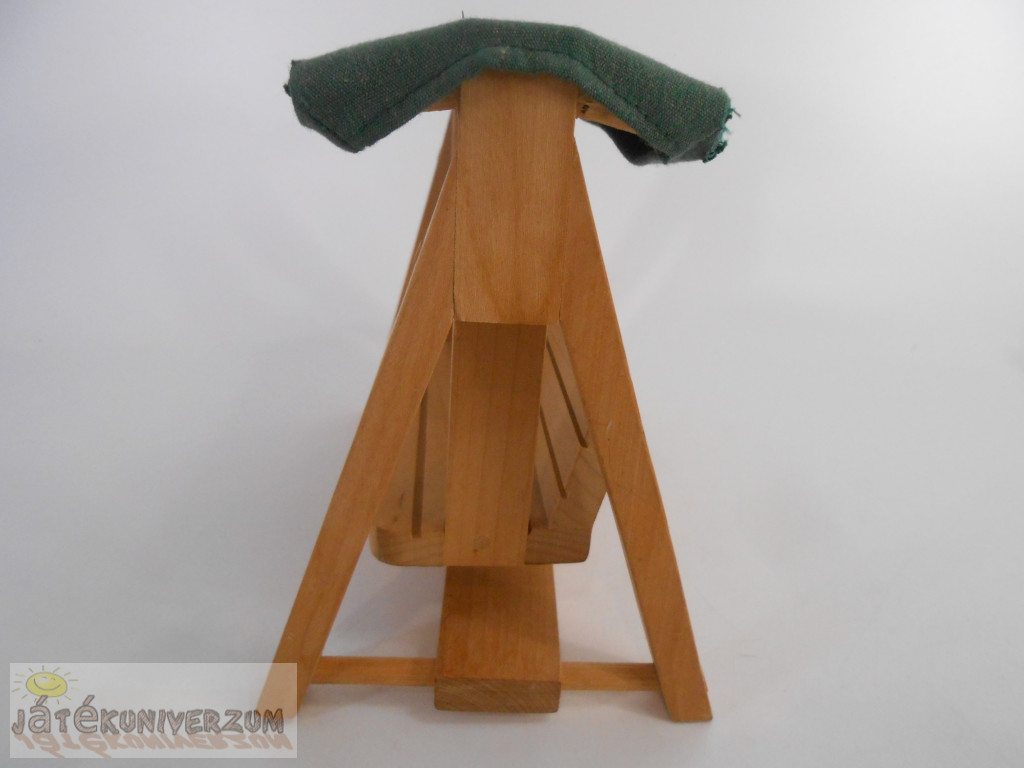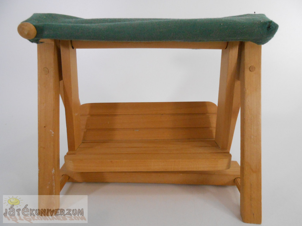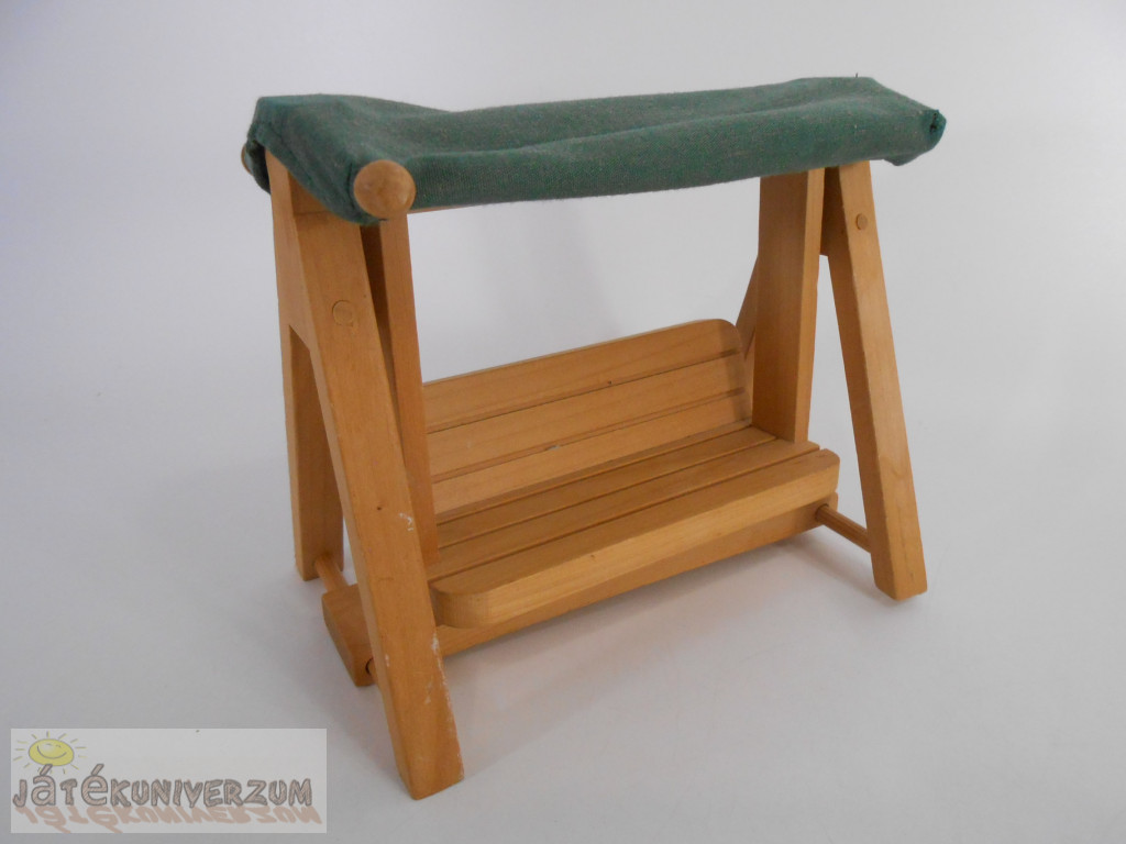 3 darabos. Az egyik egy fából készült hintaágy. A második egy játszótéri játék körhinta. A harmadik egy vintage Fisher-Price Loving Family babaház zöld kihúzható ágy-kanapé. A hintaágy textil része két sarkánál sérült. Az ágy színe el van színeződve.