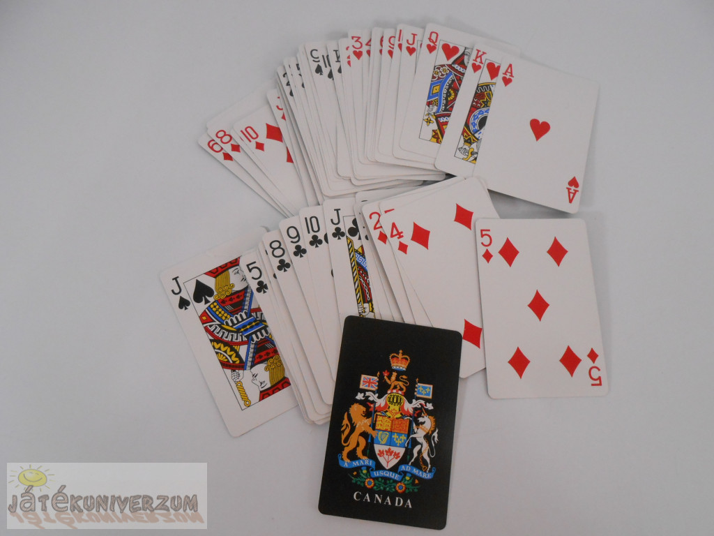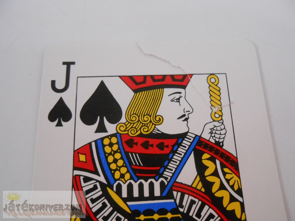 Gyári doboz nincs hozzá. Nem tartalmaz Jokert a kártyacsomag. Az egyik lapja sérült, a többi jó állapotú.